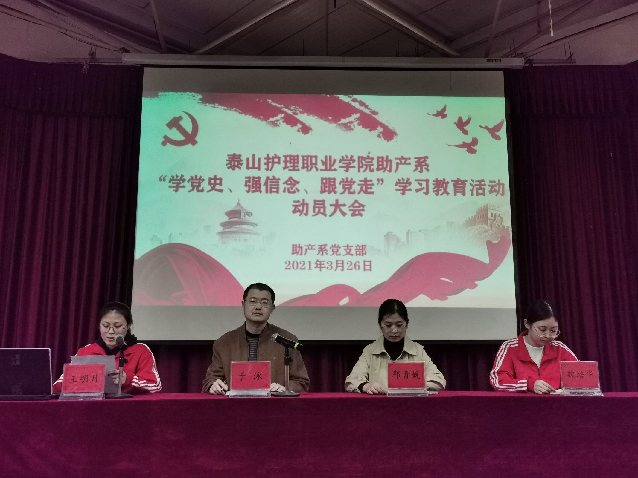 为深入学习贯彻习近平总书记在党史学习教育动员大会上的重要讲话精神,落实学院团委统一要求,3月26日,助产系在学术报告厅召开青年大学习——“学党史、强信念、跟党走”学生党史学习教育动员大会。助产系党支部书记于泳、纪检委员郭青媛以及全体学生干部参加,学生会主席王明月主持会议。
