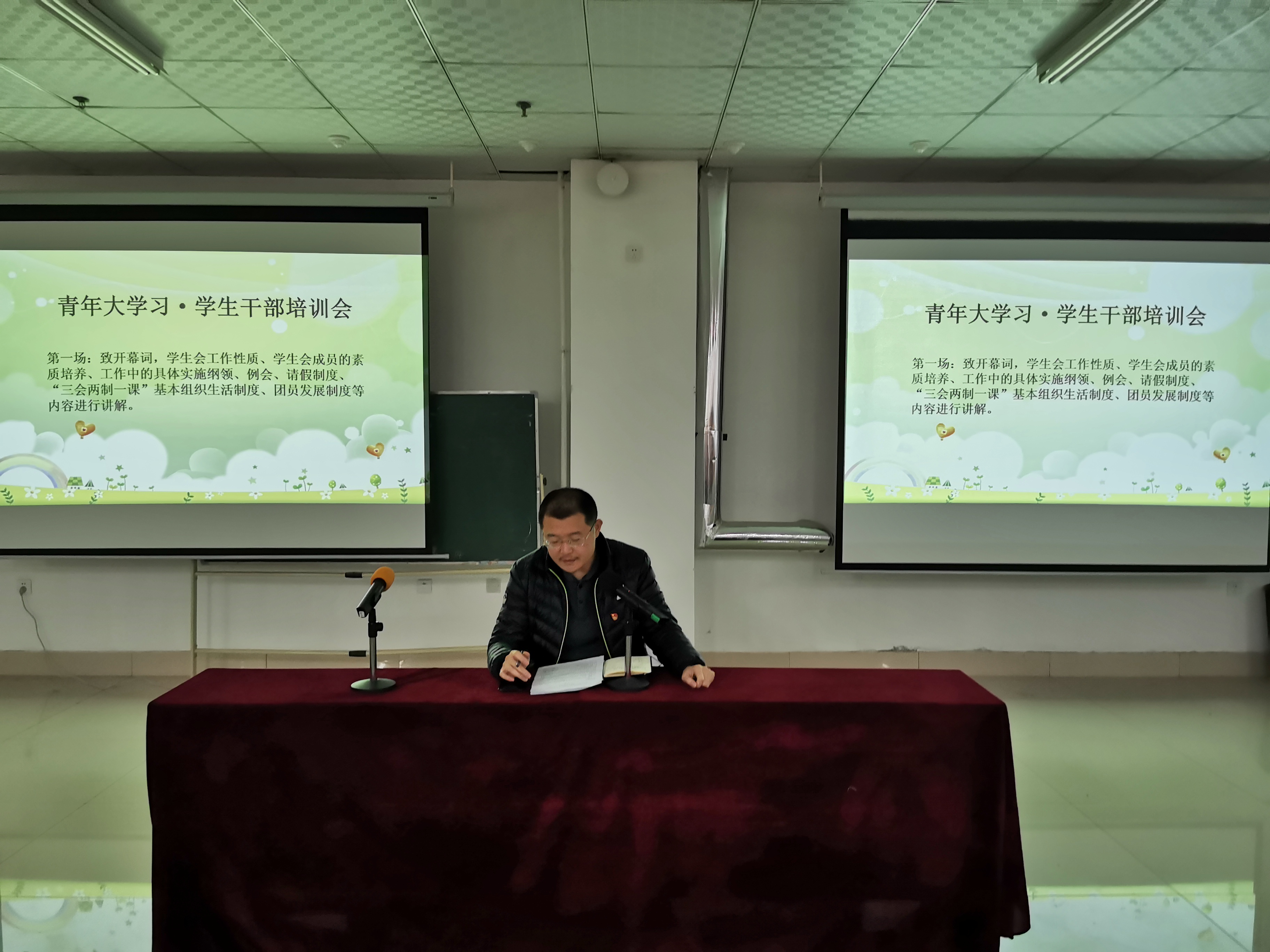 11月25日,于泳同志代表党支部向学生干部培训会的开班表示祝贺!他对学生干部提出的四点要求:一是听党话,跟党走,明确学生会职能定位,做好学校联系广大同学的桥梁和纽带;二是从严治会,明确条件,严格程序,注重培养,打造一支精干的学生干部队伍;三是敢创新,勇实践,深化改革,切实做到服务青年学生成长成才;四是热爱学习,努力工作,为同学们树立正确榜样。