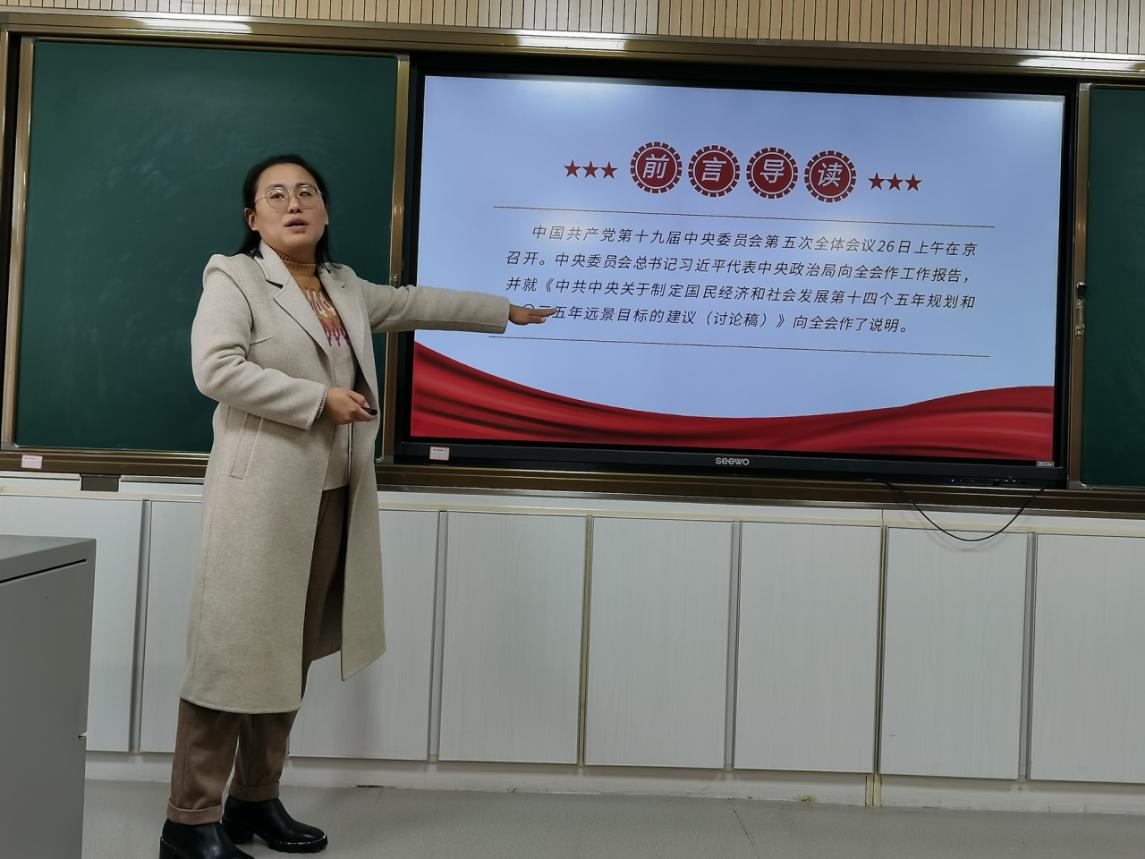 思政教研室教师赵环现场讲解了《学习十九届五中全会精神》。赵环围绕着党的十九届五中全会召开背景、有关议程、“十三五”期间取得的成就以及未来我国面临的机遇与挑战、“十四五”的总体目标和工作要求等内容进行了详细介绍。学习小组的成员们认真听讲,仔细记录,全面深入学习了全会精神。他们表示,将利用课后时间,积极向本班同学进行宣讲,将党的精神传达给每位同学。