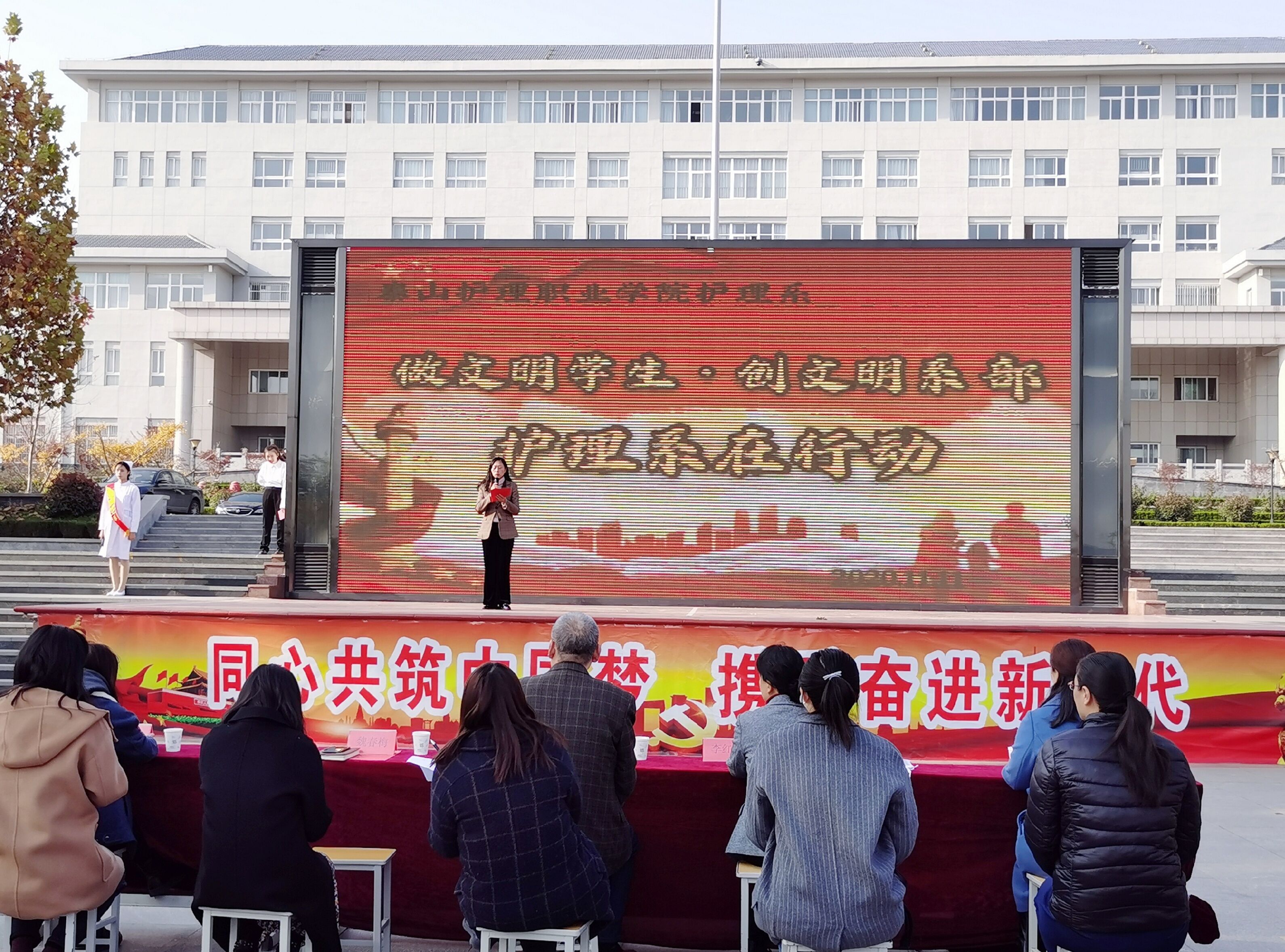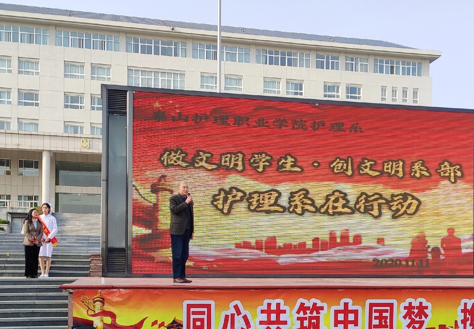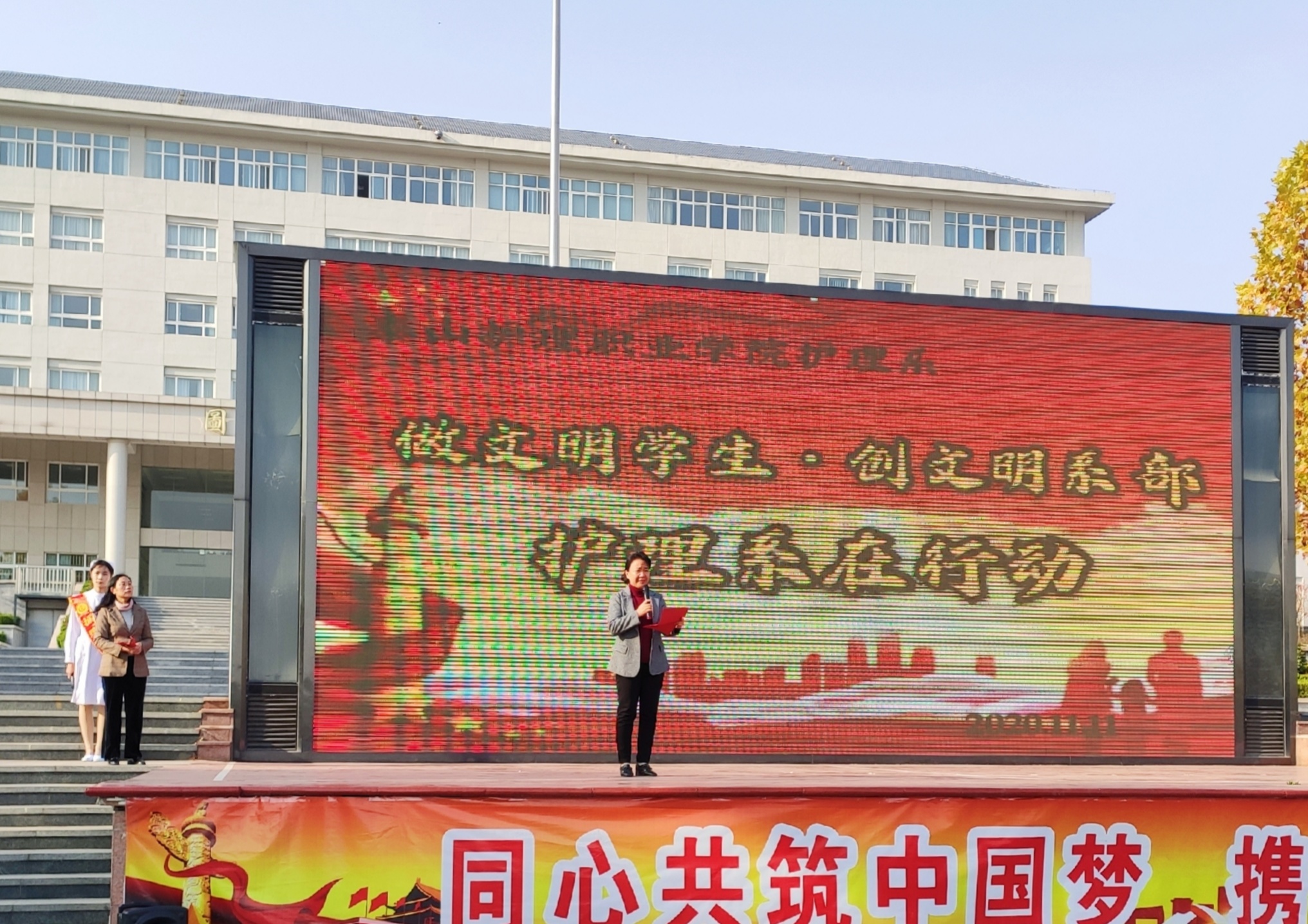 为进一步落实文明校园的创建工作,加强系部管理,提高文明素质,彰显系部特色,促进个性发展,争做文明行为的传播者。11月11日,学院护理系在LED广场举行“做文明学生·创文明系部·护理系在行动”文明启动仪式。学院党委副书记马腾文、护理系主任李红伟、护理系党总支书记魏春梅、学工处副处长李莉、护理系副主任宋菲菲、护理系全体学管及班主任老师等出席启动仪式。魏春梅主持仪式。