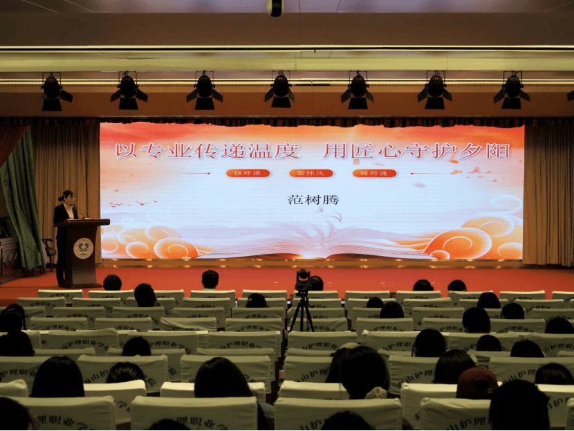 在事迹报告环节,四位优秀教师代表依次上台,分享了她们扎根教坛、潜心育人的动人故事。2025年世界技能大赛养老赛道铜牌获得者刘艳慧以《同心逐梦,聚力前行》为题,讲述了带领学生拼搏技能赛场的心路历程;第十七届山东省职业院校技能大赛二等奖指导教师范树腾通过《以专业传递温度,用匠心守护夕阳》,展现了将人文关怀融入专业教学的实践;三等奖指导教师李腾腾通过《以使命守护生命,用匠心培育未来》分享了作为学生良师益友的感悟;辅导员孙艺嘉则以《以心为灯,照亮成长之路》为题,深情讲述了在“三全育人”中守护学生成长的担当。