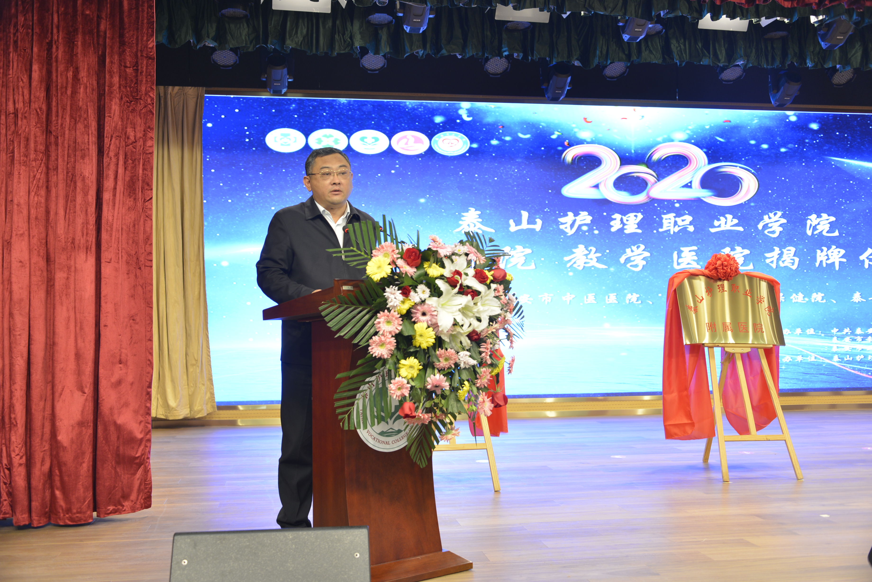 市委常委、组织部长、市委教育工委书记高尚山,市委教育工委常务副书记、市教育局党组书记、局长戴冰,市卫健委党组书记、主任张步军,市委组织部人才办副主任冷贞贞,市旅游经济开发区党工委委员、管委会副主任吕泰柱,市中心医院党委书记、院长倪庆宾,市中医医院党委书记、院长张开刚,市妇幼保健院党委书记刘传军,泰安市立医院院长杨长青,山东省煤炭泰山疗养院副院长李信生,泰安市肿瘤医院党委副书记郑珊红,学院党委领导班子成员、部分教师、学生代表参加了揭牌仪式。