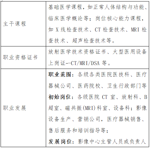 一、专业简介 医学影像技术专业创设于1998年,具有20多年的专业发展历史和办学经验,为社会培养了大批能够从事医学影像技术普通放射、CT、DSA、MRI、超声检查技术等临床工作的高素质技术技能人才。医学影像技术专业拥有临床专家和校内导师组成的“双师型”教师团队,校内教师35人,医院兼职教师10人,其中教授9人,副教授15人。团队在教学改革、校企合作、实践教学方面取得优秀成绩,2018年9月被山东省教育厅评审认定为省级教学团队。 以医学影像技术专业为核心的医学技术专业群于2022年获批山东省高职高水平专业群,专业群带头人,教授,泰安市名师工作室领衔人,泰安市优秀共产党员,从事高校教学27年,撰写教学及专业论文15篇,主编、参编教材及教学参考书12部, 二、专业课程及职业发展