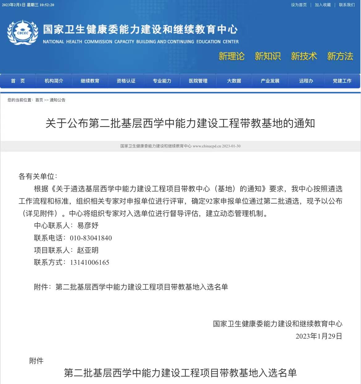 1月30日,国家卫生健康委能力建设和继续教育中心公布了第二批基层西学中能力建设工程带教基地名单,新葡萄成功入选。