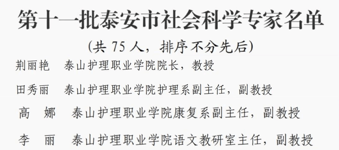 近日,市社科联公布了第十一批社会科学专家聘任名单,学院党委副书记、院长荆丽艳、护理系副主任田秀丽、康复系副主任高娜、语文教研室主任李丽入选。