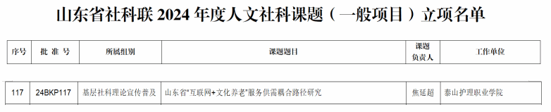近日,山东省社科联经专家组评审、网上公示、省社科联党组审定等程序,公布了《山东省社科联2024年度人文社会科学立项课题(第一批)名单》,新葡萄护理系教师焦延超申报的《山东省“互联网+文化养老”服务供需耦合路径研究》成功立项。