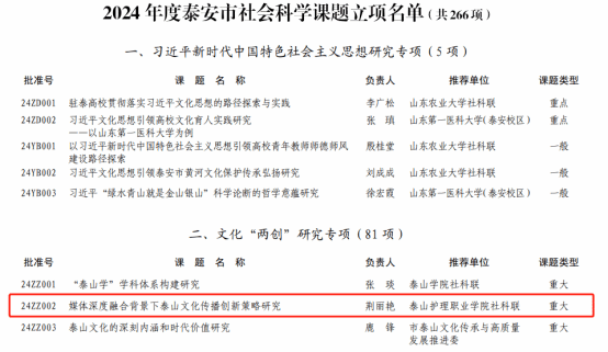 按照《泰安市社会科学课题管理办法》有关规定,经单位推荐、专家评审和市社科联党组研究,近日,泰安市社科联确定立项课题共266项。其中重大课题6项、重点课题67项、一般课题193项。同时,给予重大课题资助经费每项2000元,新葡萄院长荆丽艳申报的《媒体深度融合背景下泰山文化传播创新策略研究》立项重大项目。
