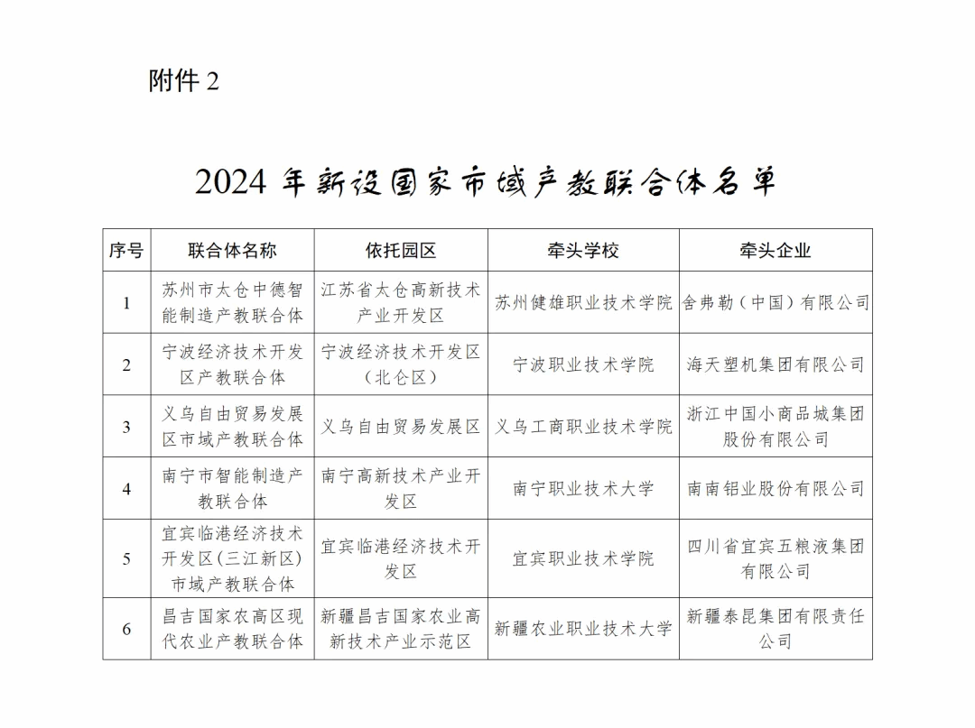 (二)精准培育。教育部将市域产教联合体建设纳入部省会商内容,将与部分省级教育行政部门、市(县)政府、牵头学校和企业进行会商,通过评估、调研、监测等形式,精准分批培育建设新设国家市域产教联合体(2024年新设国家市域产教联合体名单见附件2),并在职业教育新一轮改革项目等方面对国家市域产教联合体进行倾斜。各级教育行政部门要协同发展改革、财政、税收、金融、土地、工业信息化、商务等部门建立联动机制,指导各牵头单位,有序推进市域产教联合体建设,确保建设质量。