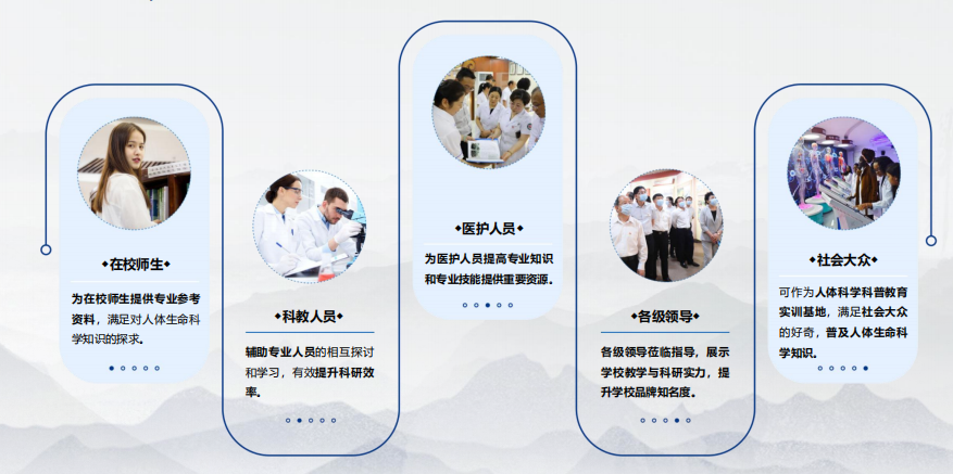 生命科学馆已在专业医学教学维度(孕育胚胎、人体系统)、大众科普宣传维度(健康科普、急救知识)、精神文化建设维度(人文建设、生命教育)等多维度进行拓展。坚持以“探人体之秘、叹生命之韵”为设计主线,紧贴“健康与医学”两大主题为布展思路,涉及知识范围从微观到宏观,从正常到病理,从基础到临床多学科交叉融合,兼顾学生学习和社会服务,让观众从生命起源诞生开始,逐渐了解人类进化、胚胎发育、人体系统、健康与疾病等知识。从一个完整的生命循环中,探索生命从无到有,从出生到死亡,从健康到疾病不同历程的无穷奥秘。从健康到病变,从专业到科普,全方位的表达,打破了传统医护类的学科界限,旨在以全生命周期为中心,体现人文关怀,服务于护理康养专业群的建设。