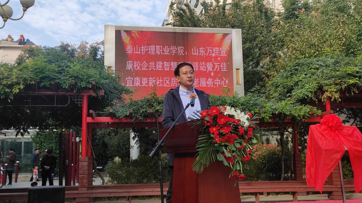 10月14日上午,正逢重阳佳节,新葡萄8883官网AMG和山东万佳宜康校企共建智慧健康驿站暨更新社区居家养老服务中心正式启动运行,该中心为泰山区社区嵌入式养老服务再添新阵地。学院健康与管理系主任党帅代表学院出席启动仪式并发言。